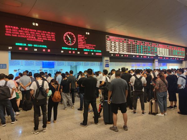 2号售票厅内,站内广播、大屏正在播放列车晚点停运信息,工作人员在宣传引导、询问答疑,乘客有序排队退票。
