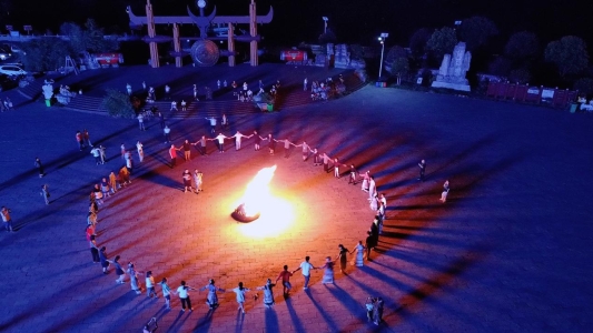 入夜,当地村民为媒体团带来跳花坡、篝火舞等表演,并邀请媒体记者一同围着篝火牵手舞蹈。篝火温暖,舞蹈热情,现场热闹非凡。