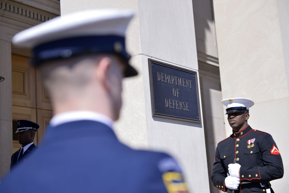 这是美军仪仗队士兵在五角大楼外参加仪式的资料照片。新华社记者殷博古摄