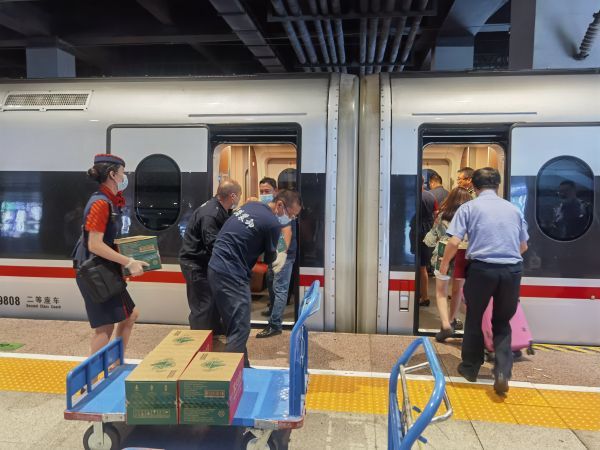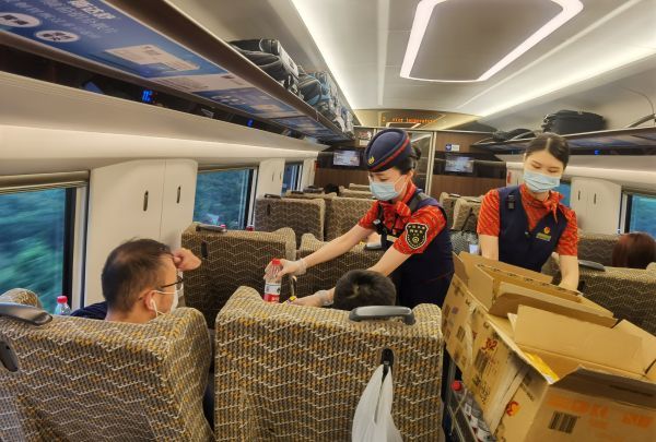 一路上,周杰和乘务员耐心地向旅客们做好解释,考虑到可能晚饭时间旅客们会饿,周杰便向路过的石家庄站申请来应急餐食——饼干和矿泉水,免费分发给旅客们。