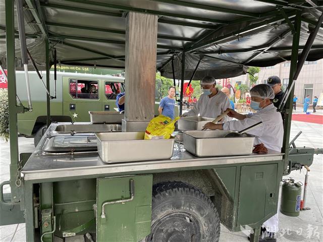 早上7点,车队将携带的方便面、矿泉水、面包等物资分发给受灾群众。两小时后,启动野战炊事车做饭。到中午12点,安置点1000多人的午餐已准备就绪。