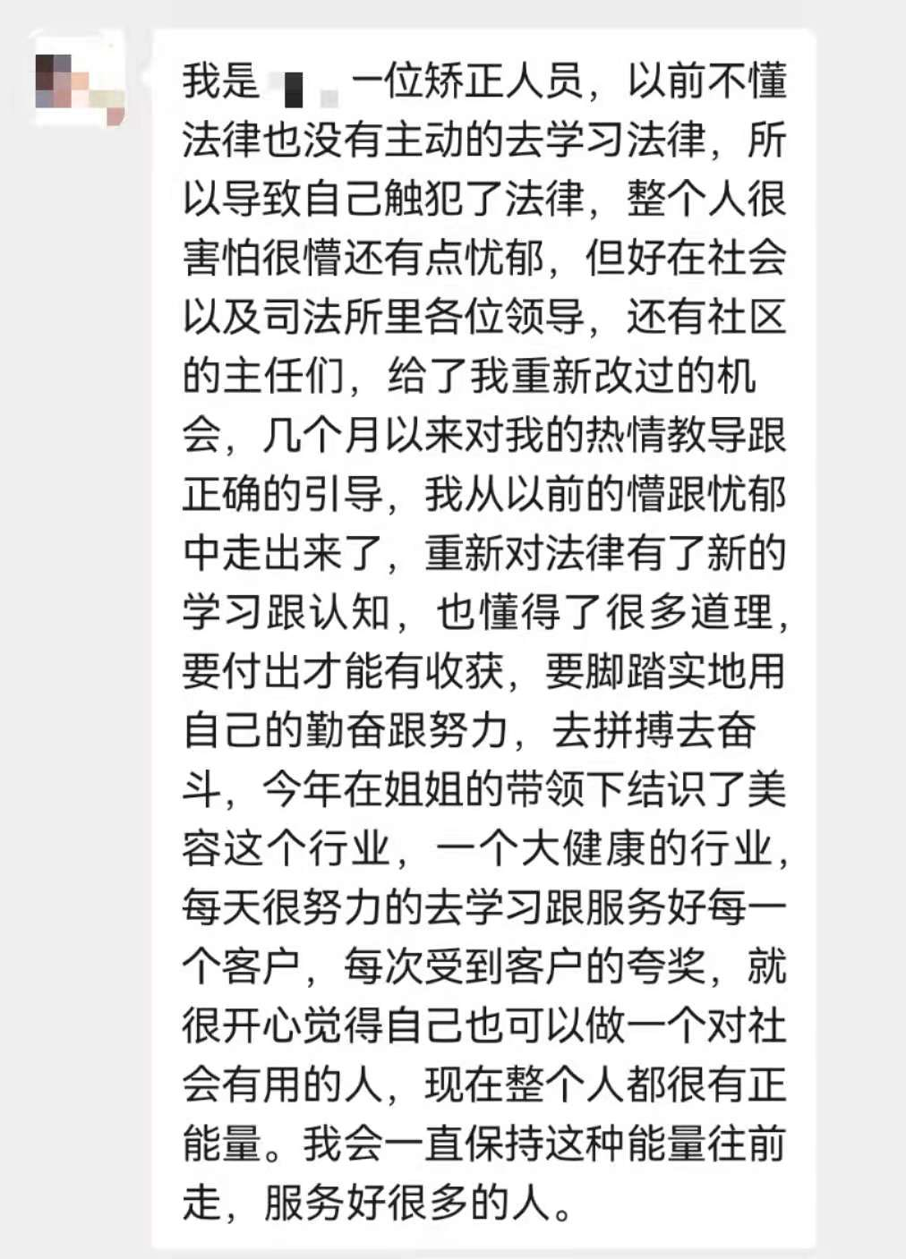 “感谢司法所人员的关怀与支持,我的生活才越来越好”。安陆市某社区的小杨,经朋友介绍做了所谓的“客服”,通过打电话骗取被害人钱财和个人信息,直到被拘留羁押才追悔莫及。2021年1月,小杨以帮助信息网络犯罪活动罪被判处有期徒刑六个月,缓刑一年,现在在开发区司法所进行社区矫正。