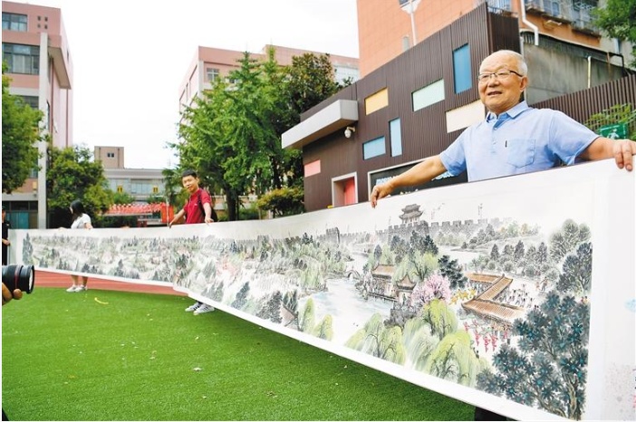 “我就是把平常在公园里看到的一些运动场景通过绘画呈现出来,展现西安全民健身的氛围。”78岁的西安老人高兴周用时近一年绘制了一幅14米长的西安护城河晨练图,将公园里各具特色的运动场景展现出来。