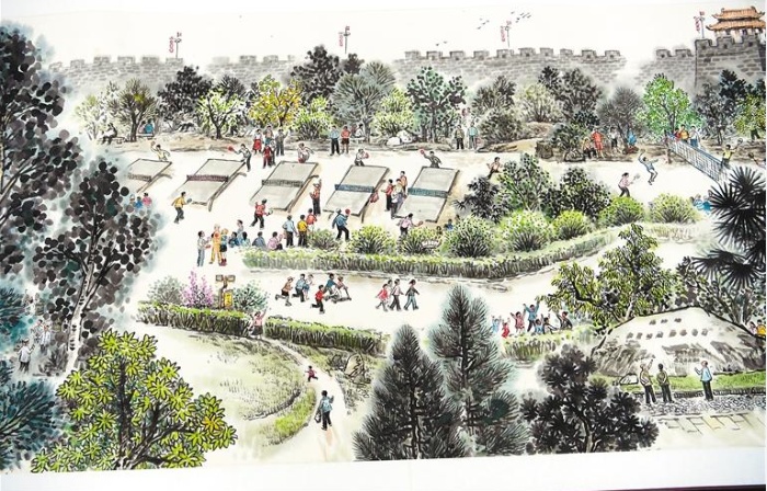 高兴周退休之前是大学南路小学的一名美术老师,退休之后他经常在环城公园遛弯。“我看到公园里市民有放风筝的、练字的、打羽毛球的、跑步的,觉得很有趣,就想把这类场景记录下来。”高兴周介绍,刚开始他是按照单人画的,后来边走边画,慢慢收集素材,又把公园里其他景物也画了出来。这期间他用了三个速写本,拍了很多照片。画中人物1800余人,每个人的表情、衣服、动作都不同。