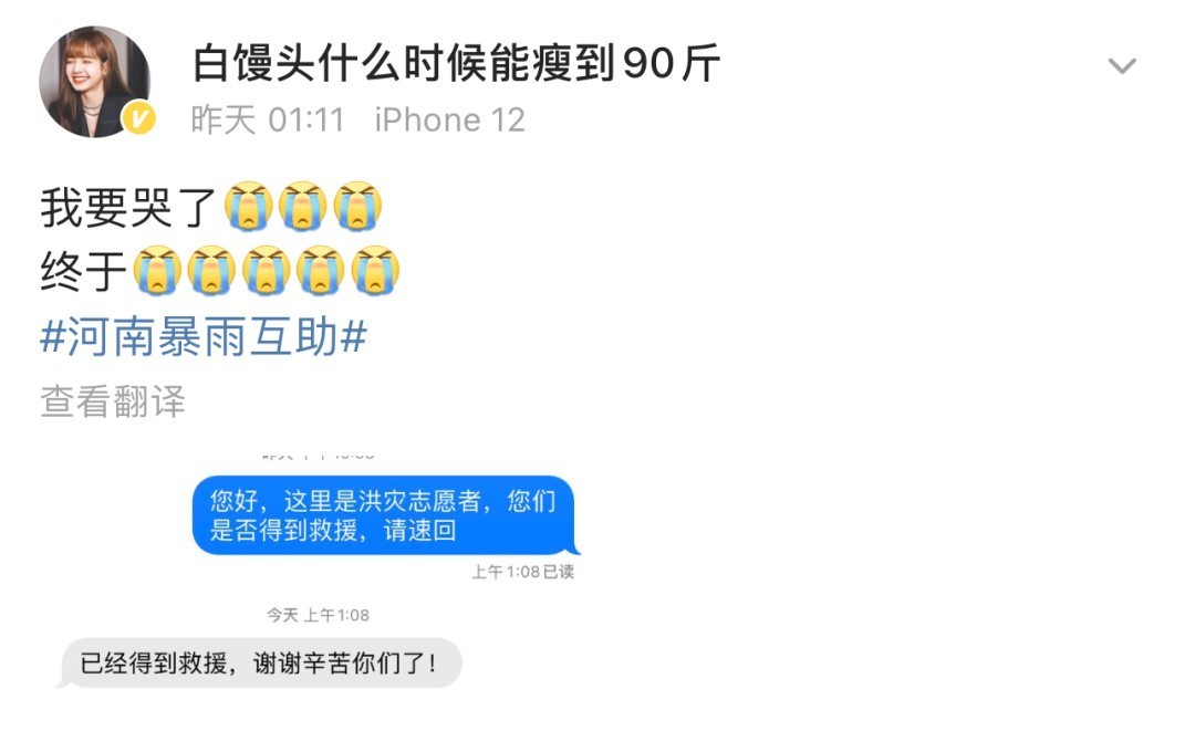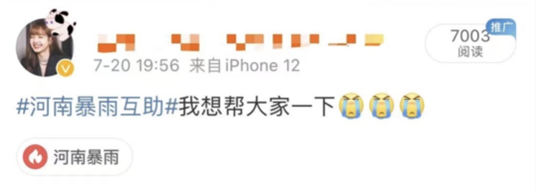 19:56分,她在微博中发了第一条#河南暴雨互助#话题:“我想帮大家一下”。