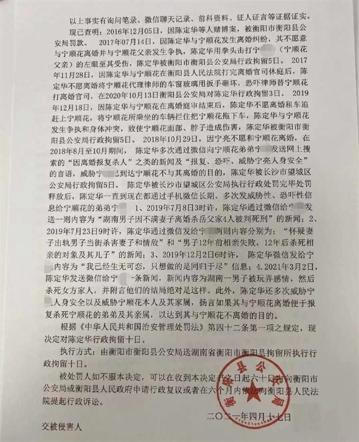 警方文件显示,陈定华因为与宁顺花的离婚纠纷,打伤宁顺花父亲、恐吓宁顺花的律师、与宁顺花发生冲突致她受伤、多次发微信威胁恐吓宁顺花的弟弟,先后被警方行政拘留5次。
