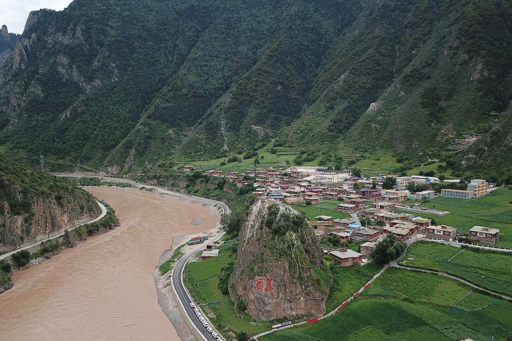 跨过川藏交界的金沙江,向西眺望,石山上“西藏”两个红字映入眼帘。石山旁的村庄就是昌都市江达县岗托镇岗托村。
