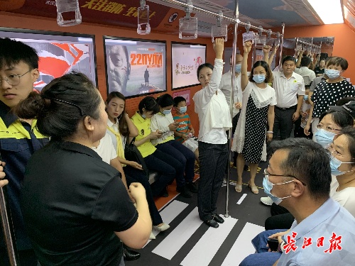 参观者在仿真地铁车厢内学习应急安全知识。 长江日报记者乔驰 摄