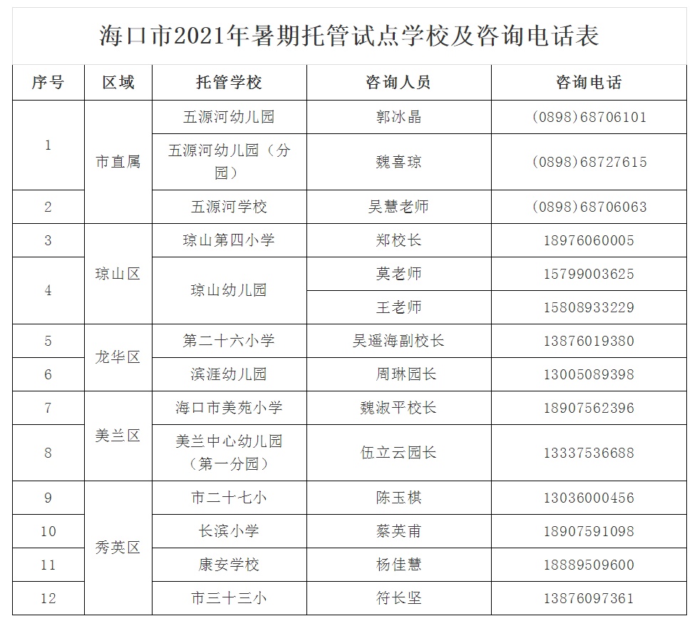 今年暑假,海口市将在海口市五源河学校、海口市康安学校、海口市滨涯幼儿园、海口市琼山第四小学以及海口市美苑小学等12个试点学校(幼儿园)开展暑期托管服务。目前各校正在进行摸底调查,将根据家长的托管需求,结合学校情况,进一步确定暑期托管的内容和规模。
