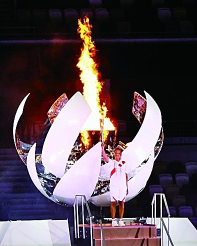 日本运动员大坂直美在开幕式上点燃主火炬。新华社发