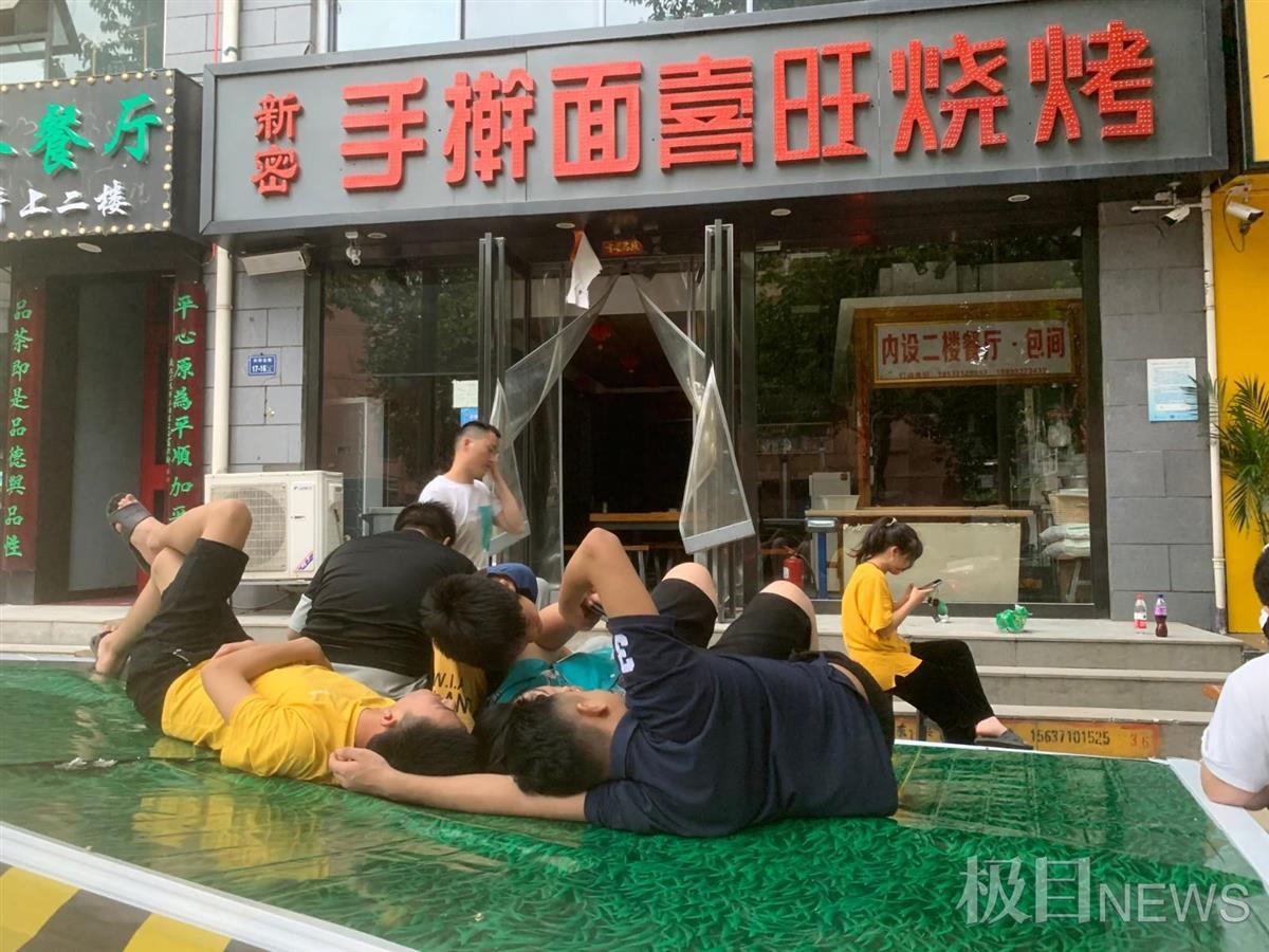 因为没水没电,房间里有些闷热,到了晚上,许多郑州市民都出来到街头乘凉,几个男青年,则干脆睡在门前塑料板上凉快凉快。