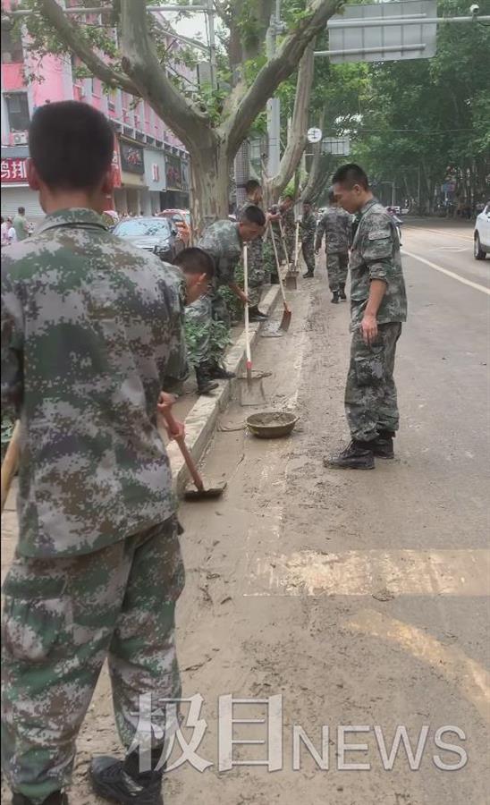 在郑州主城区,许多街道上都被覆盖了一层厚厚的泥浆,还有许多路段有渍水,所以交通比较拥堵。7月23日,极目新闻记者看到有大批的人民子弟兵在街头清理淤泥。