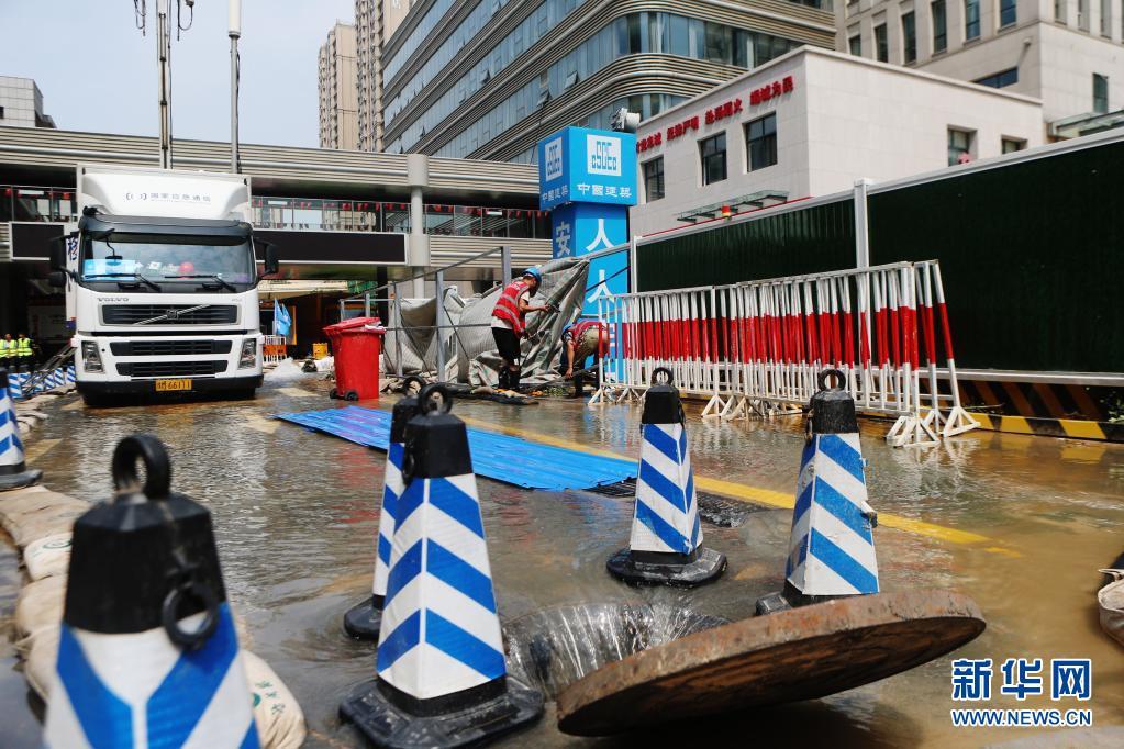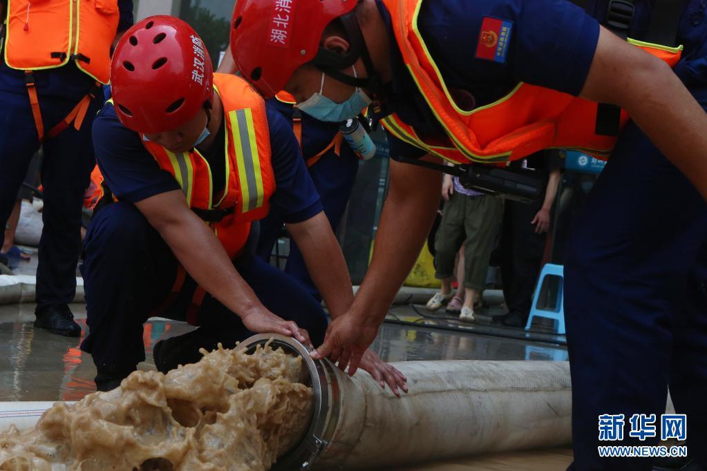 7月24日,在郑州大学第一附属医院河医院区,救援人员进行排水作业。