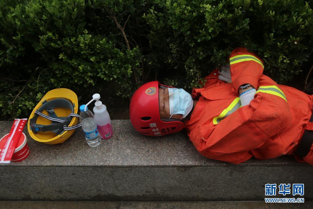 7月24日,在郑州大学第一附属医院河医院区,救援人员在工作间隙休息。