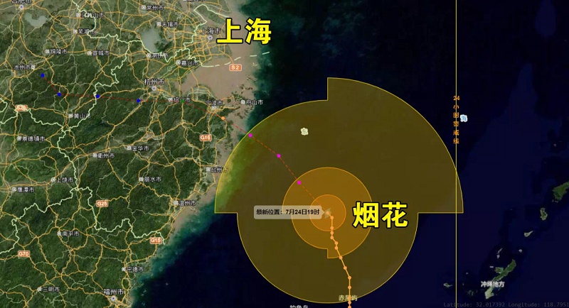 :预计25日上海将出现阵风12级以上的大风。台风“烟花”24日至26日会给上海带来明显风雨影响。强降水主要集中在25日至26日,雨量可达暴雨到大暴雨,局部地区有特大暴雨。