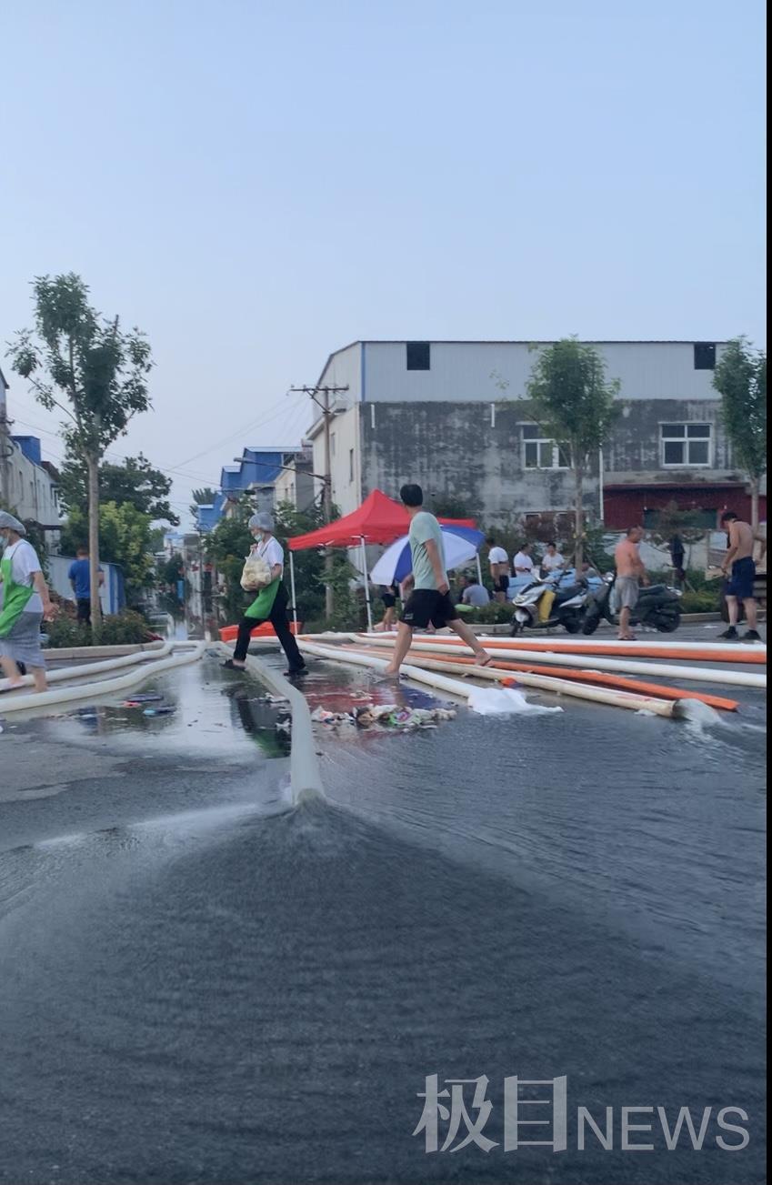 记者看到,多个村民小组的出入口都铺满了水袋,数十台水泵正在连夜抽排,将水抽到地势较高的马路上,再通过排水管网流入孟姜女河。