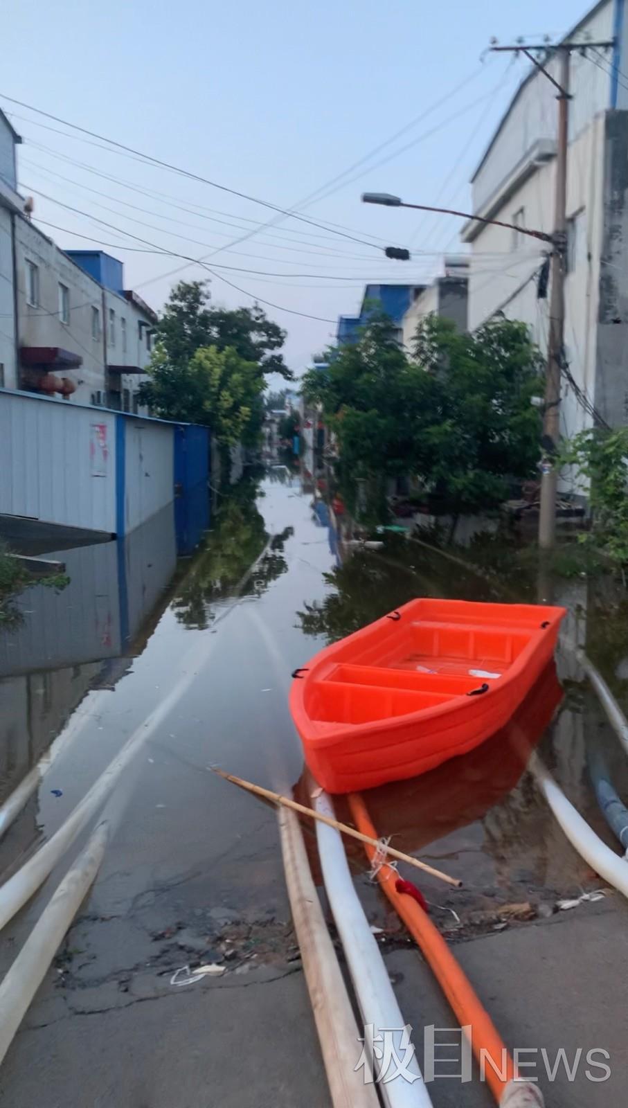 7月25日傍晚,极目新闻记者来到新乡市牧野区和平路街定国村探访。只见通往村里的多个路口,均是一片汪洋,有村民划着船从村里出来。