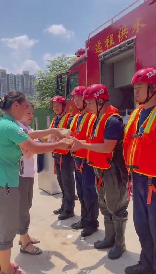 25日中午,郑州市中牟县,在渍水中忙了一上午的武汉消防救援人员刚回到休整点,两位当地大妈就拎了面桶过来送午饭,刚下的烩面、新蒸的馒头,热气腾腾地送到官兵手中。