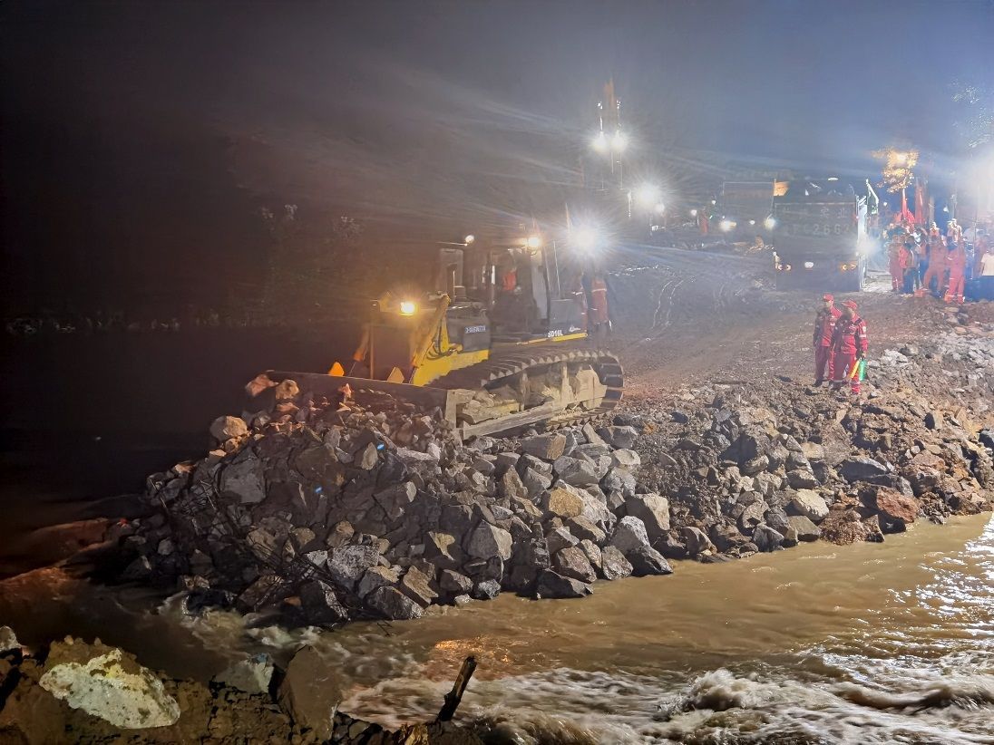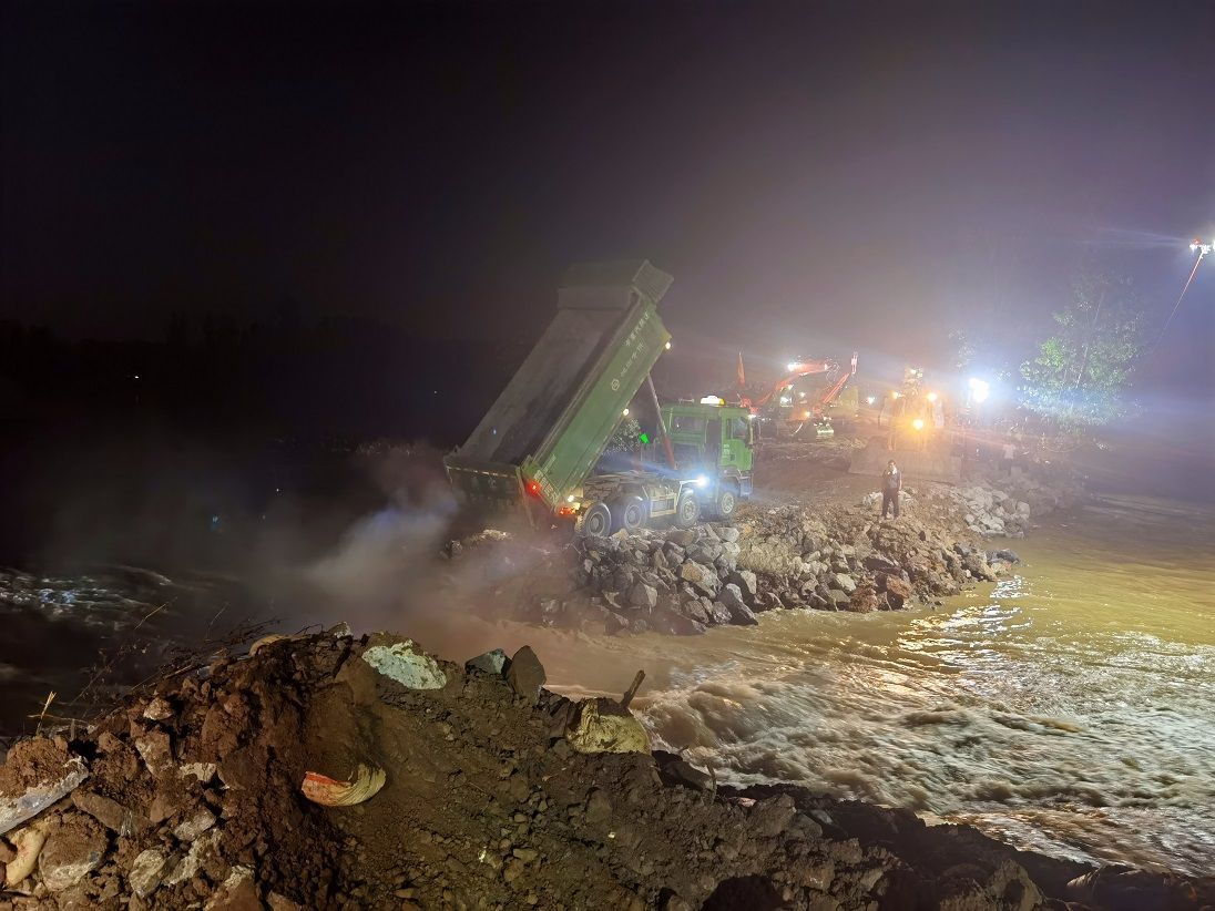 “现在最大的难题是右岸不断垮塌,左岸进占越快,龙口越窄水流速越大,右岸就垮塌得越快。”右岸指挥员、中国安能唐山救援基地指挥长刘其森一脸疲惫。25日凌晨1时,龙口一度只剩下4米多,但由于右岸不停垮塌,截至6时,龙口仍有4米宽。专家组决定“双管齐下”处理流速冲刷决口影响进度的问题,一方面,现场就地取材,用挖掘机将二十余棵大树、公交车等推入放置决口处,缓减水流速度。另一方面,采用三层钢筋笼、将12个1立方米钢筋笼一起串起来的办法,进行护角。25日下午,因为土质松软,决口右岸堤坝又连续发生垮塌,决口再次扩大,数辆渣土车和公交车被投入水中也未能封堵住决口。