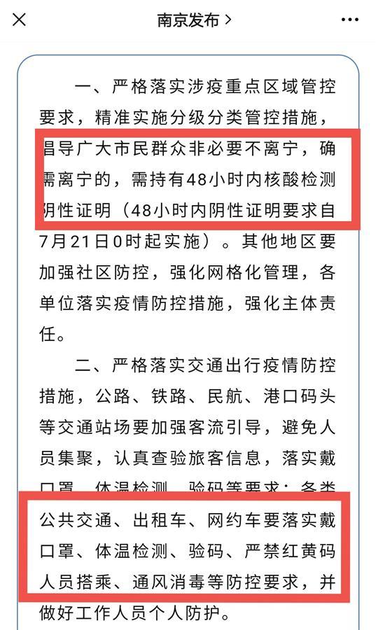 极目新闻记者注意到,早在21日,官方发布的第1号通告中就明确写道:确需离宁者,需持有48小时内核酸检测阴性证明(自7月21日0时起实施)。同样在21日发布的第3号通告则进一步指出,通过公路驾车离宁的司乘人员应持有48小时内核酸检测阴性证明。