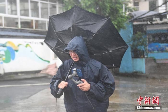 7月26日,浙江嘉兴,一名媒体记者的雨伞被吹翻。 中新社记者 王刚 摄