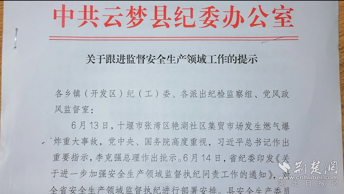 云梦县纪委监委下发《安全生产工作提示》。通讯员 供图