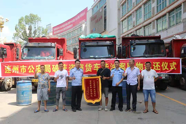 7月23日,连州市公安局举行赃物返还仪式,将沈某军、黄某贵团伙所盗取的柴油返还被盗货车司机。面对失而复得的柴油,事主连连称赞,并为民警送上锦旗以表谢意。
