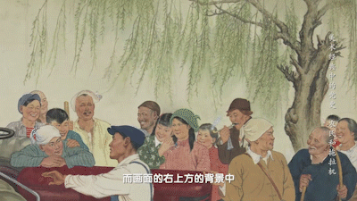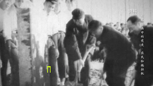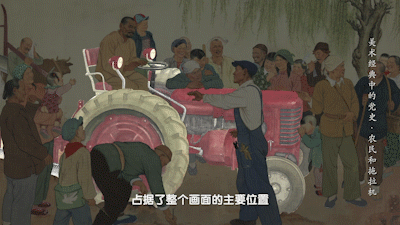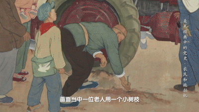 画面下方一位老人用一个小树枝戳到土地里,仿佛是在测量牛耕的地深,还是拖拉机耕的地深,对比说明拖拉机要比老牛拉犁要耕得深、快、效果还好,也体现了农民对新生事物的接受。