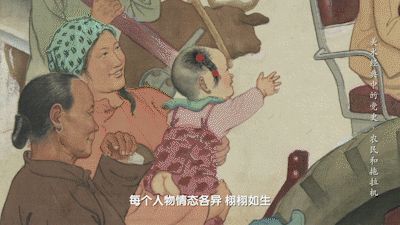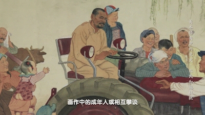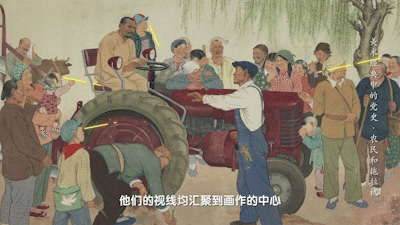 画作中穿着开裆裤向拖拉机挥手的幼儿、戴着红领巾的学生、站在拖拉机上威风十足的男孩、拖拉机机头前向内看去的儿童与最右侧正在张望的婴儿,他们的视线均汇聚到画作的中心——拖拉机上。