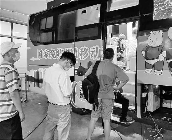 旅客们在移动接种车上接种疫苗。
