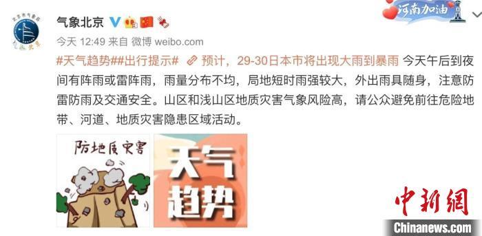 中新网北京7月28日电(记者 陈杭)记者从北京市气象部门获悉,受高空槽和台风“烟花”减弱的低压外围云系共同影响,预计29日至30日北京市将出现大雨到暴雨。