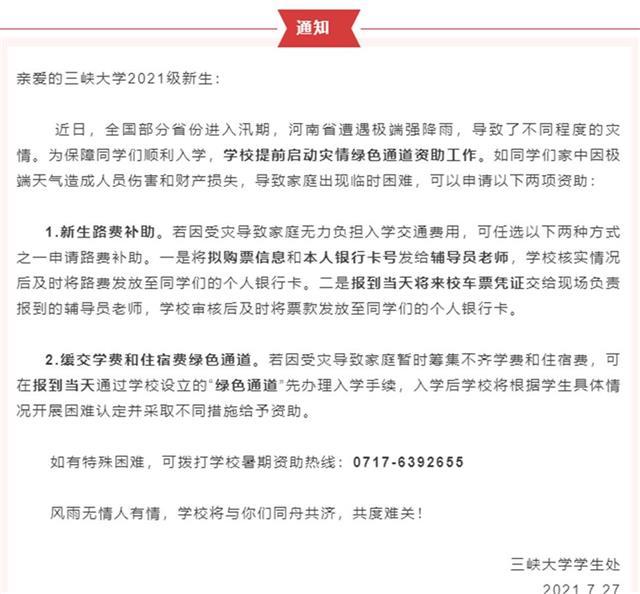 7月27日,三峡大学发布通知,为河南受灾家庭新生提前开通绿色通道。