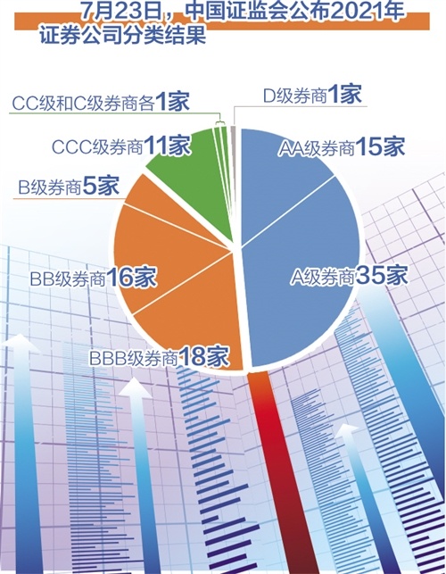 一年一度的券商评级“大考”成绩日前揭晓。7月23日,中国证监会公布2021年证券公司分类结果,AA级券商共15家,A级共35家,BBB级共18家,BB级共16家,B级共5家,CCC级共11家,CC级、C级、D级各1家。