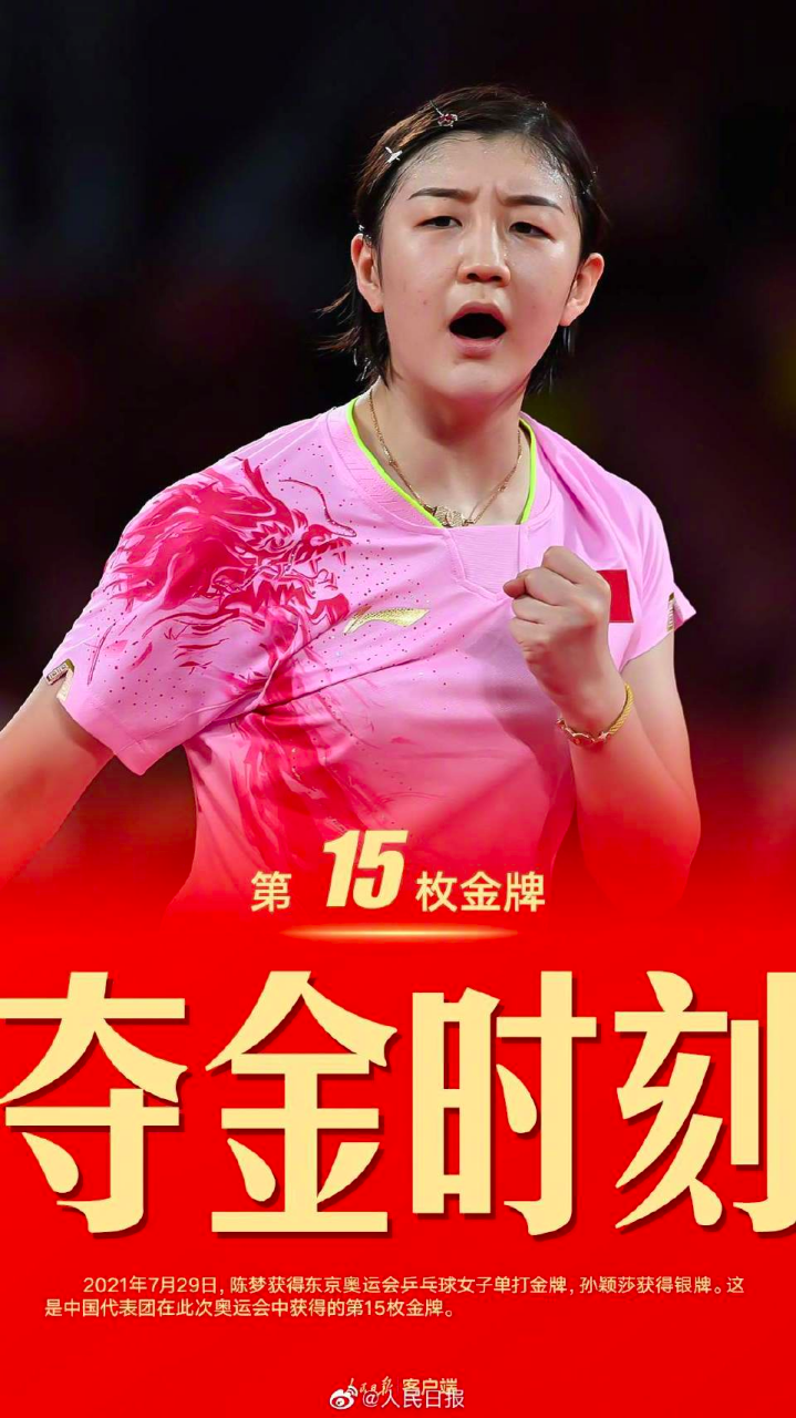 7月29日,在东京奥运会乒乓球女单决赛赛场上,是两名来自中国代表团的选手。陈梦最终以4比2击败队友孙颖莎,获得了中国的第十五枚金牌。这是中国乒乓球队在本届奥运会的首枚金牌。获胜后的陈梦第一时间奔向自己的主管教练马琳,与他紧紧拥抱在一起。“这枚金牌是对长期付出的最好回报,在奥运会的舞台圆了我多年的梦想。”陈梦说。