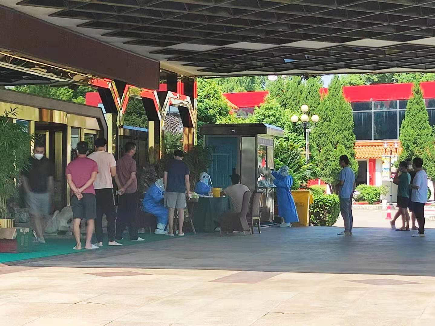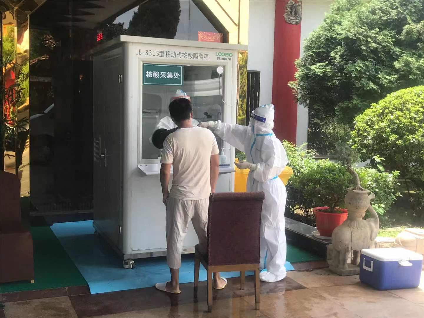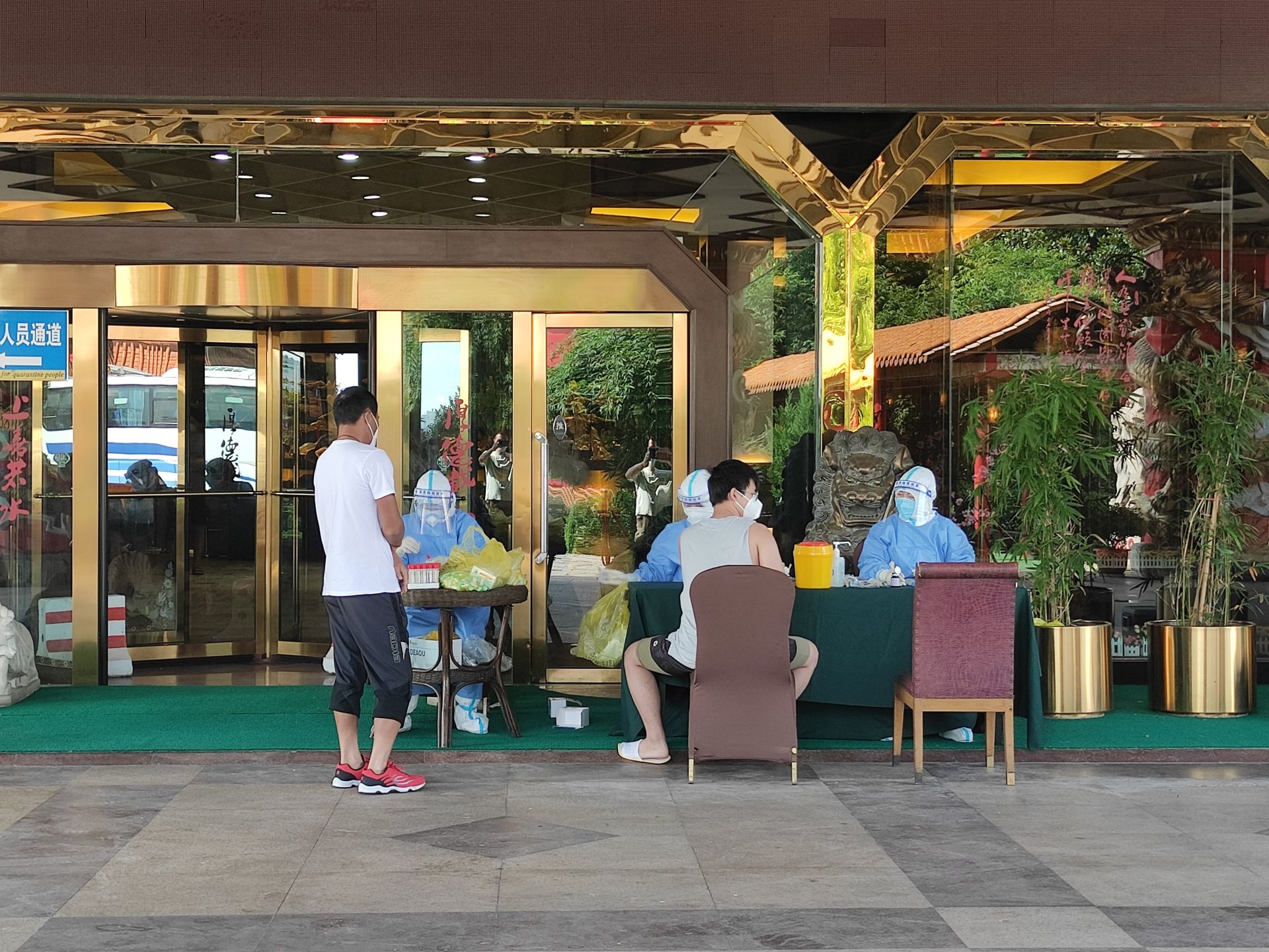 荆楚网(湖北日报网)讯 (记者肖慧婷 实习生刘越 通讯员孙四海 陈琪伟 许贤池)“来,请张开嘴。”“好了,可以了,谢谢配合。”近日,在武汉市洪山区一境外返汉酒店隔离点门前,来自湖北省荣军医院的医务人员正在为境外返汉人员进行核酸检测,由于天气炎热,几位医务人员的防护服很快被汗水浸湿。