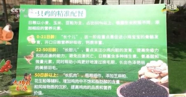 说到“精准散养”,还体现在鸡吃的食物上,这个展板写着“一只鸡的精准配餐”,一般是三个阶段,简单概括了一下就是“长个儿”“长胆儿”和“长肌肉”。