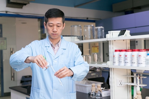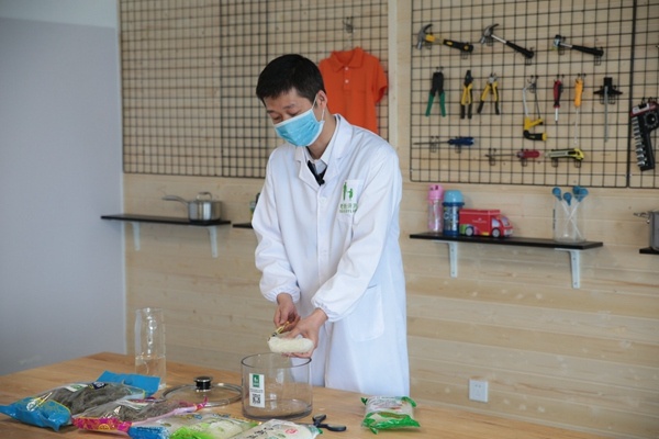 图为魏文锋正在做实验,为“塑料粉丝”(食品)辟谣。