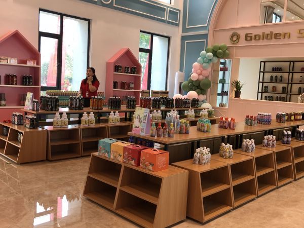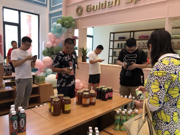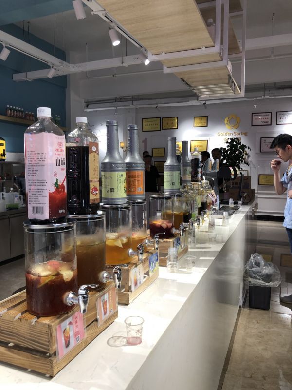 除了观看产品的生产,游客们还能亲自品尝公司饮品。在工厂一楼大厅,公司设置了一个产品吧台,工作人员在台内调制好各种产品,游客可以根据自己的需求选择品尝,吧台下面还设置了休息区,提供了沙发和茶几让游客们休闲放松。“参观后坐在这里,喝着美味的酸梅汤,舒服哇!”一位来自浙江的经销商感叹。