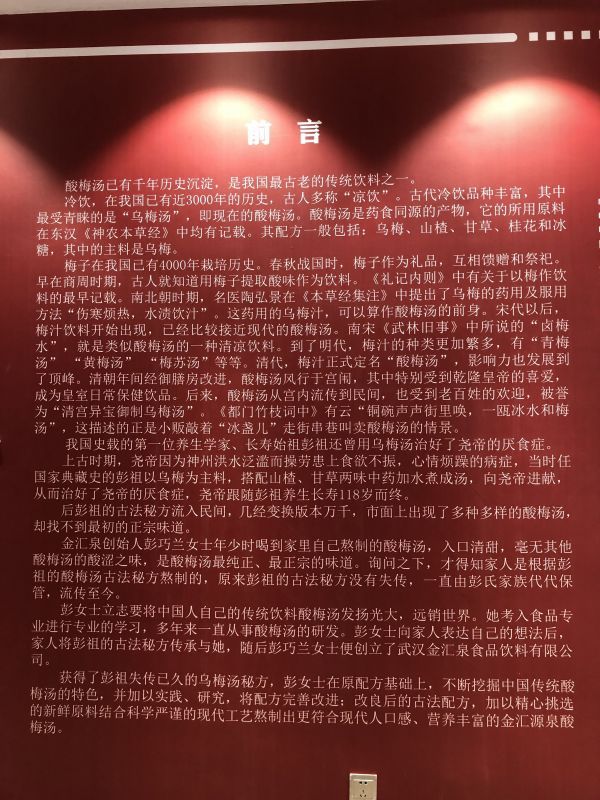 在武汉金汇泉食品饮料有限公司新厂房内,公司开辟了全国首家酸梅汤历史文化博物馆,博物馆不仅介绍了酸梅汤的历史演变,还详细介绍了酸梅汤对人体健康的作用。另外,公司还将自己的酸梅汤配方展示在博物馆内,供游客参观学习。