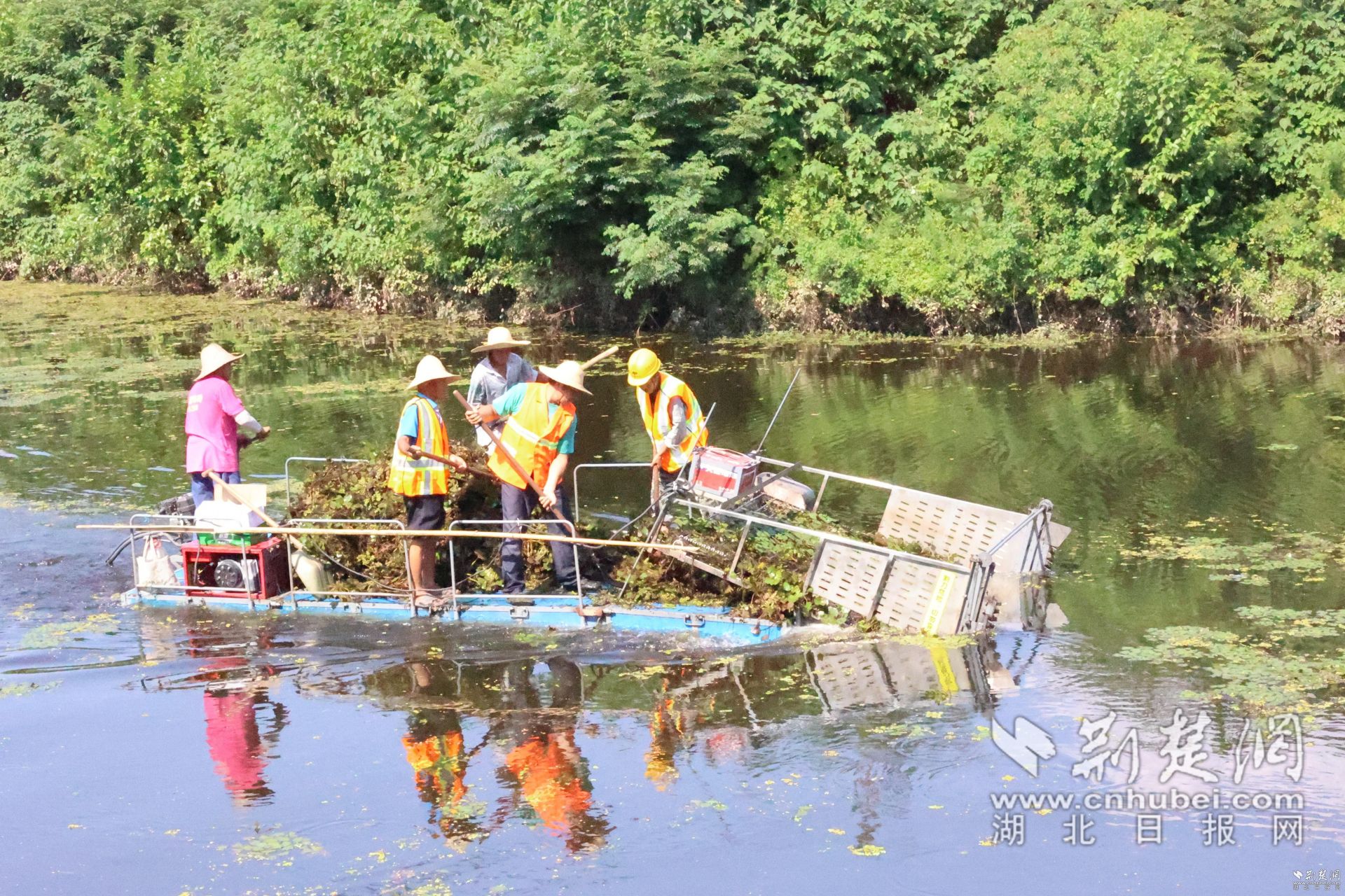 荆楚网(湖北日报网)讯(通讯员高巧燕)盛夏七月,鸟语蝉鸣,万木葱茏。在澴河大桥以西,旧316复线旁的卧龙乡七里村,蜿蜒曲折的复兴河穿村而过,河面上,几位环卫工人站在打捞船上,清理着传送带卷上来的水草杂物。“现在天气热,青苔等水草繁殖得非常快,环卫工人每天早上六点多就上船巡河打捞了,平均一天要打捞近30船的水草青苔,一次打捞的水草就有一千多斤,”7月30下午,在复兴河畔,卧龙乡农业服务中心负责人李文平说。