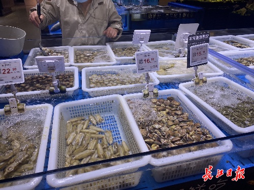 超市里,水产海鲜货源充足。长江日报记者孙珺 摄