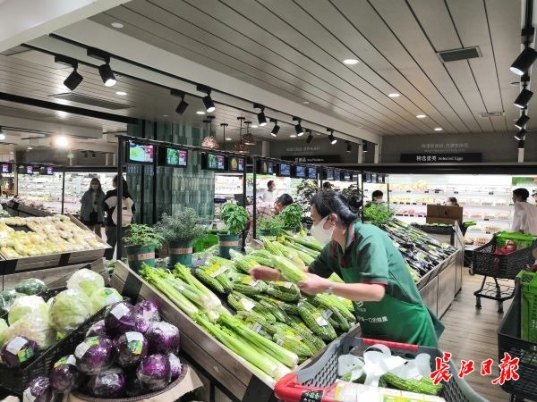 北京华联生活超市武汉百瑞景门店内工作人员正在上架补充蔬菜。长江日报记者赵歆 摄