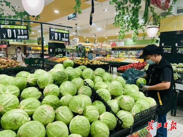 3日中午,记者来到北京华联生活超市武汉百瑞景店,在生鲜区域,西瓜、番茄、平包菜等蔬果俱全,有工作人员正在上货,补充商品。“今天我们特意加了人手,帮忙及时上货!”现场,一正在忙着补充货架商品的工作人员表示,会多次补货,请市民放心。在一旁安全公示栏上,显示了白菜、菜心、生菜、菠菜等蔬果进货渠道、产地与检测信息。价格方面,记者看到当日“平包菜”为1.89元/斤、空心菜为2.99元/斤、茄子2.99元/斤。“感觉价格没有什么太大变化。”家住附近的徐女士说,这下安心多了。