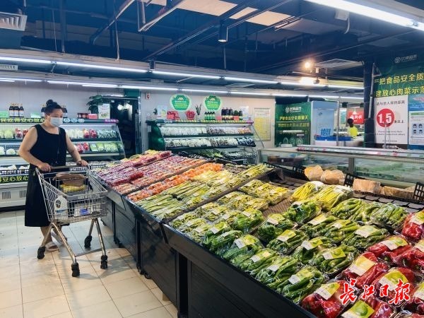 中百超市滨湖名邸店里,丝瓜、苦瓜、冬瓜等夏季受欢迎蔬菜均有备货。“天天都有新鲜菜上架。”一正在整理货架的工作人员表示,市民不必“囤”菜,按需购买即可。记者注意到,当日冬瓜单价为0.58元/斤,南瓜1.58元/斤,土豆1.68元/斤,本地丝瓜2.58元/斤。