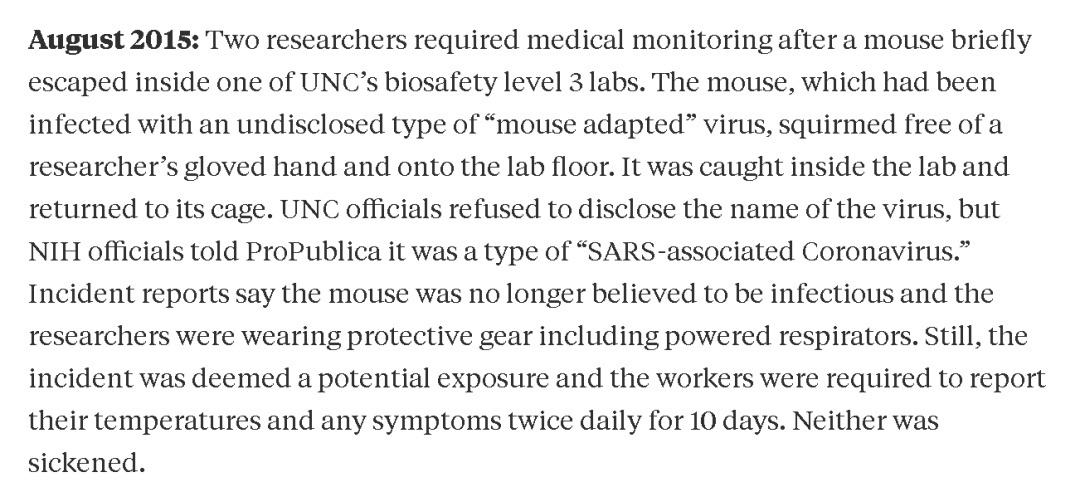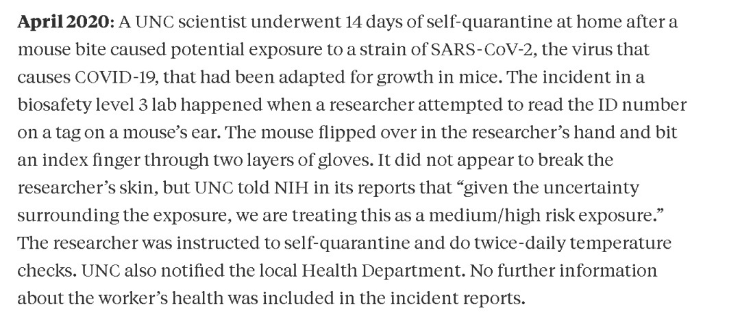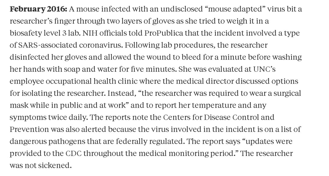 2016年2月,一只感染了SARS类冠状病毒的老鼠咬穿了实验人员的两层手套并咬伤了此人的手指。尽管此人当时进行了消毒工作,而且这一事故涉及的是被美国疾控中心列为“危险”级别的病毒,可北卡罗来纳大学并没有隔离此人进行医学观察,只是要求此人在公共场合和工作时带医用外科口罩和每天上报2次体温。最终该校也宣称此人没有染病。
