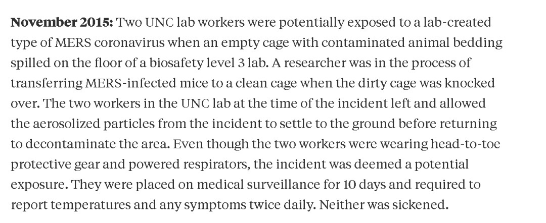 2015年11月,一个用来放置感染了实验室人造MERS类病毒动物的容器,又摔在了地上。涉及此次事故的实验人员之后被要求进行医学观察,但并不是隔离,只是每天上报2次体温,最终该校宣称没有染病。