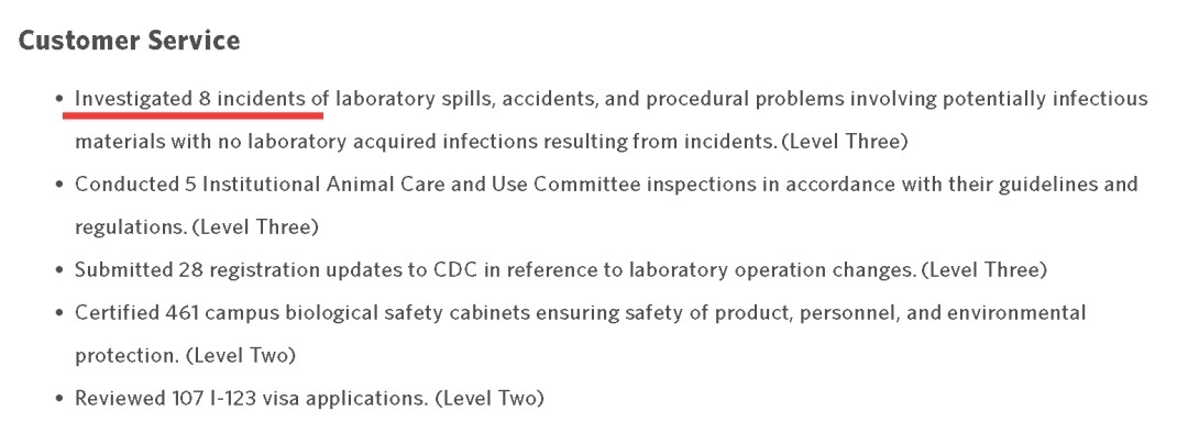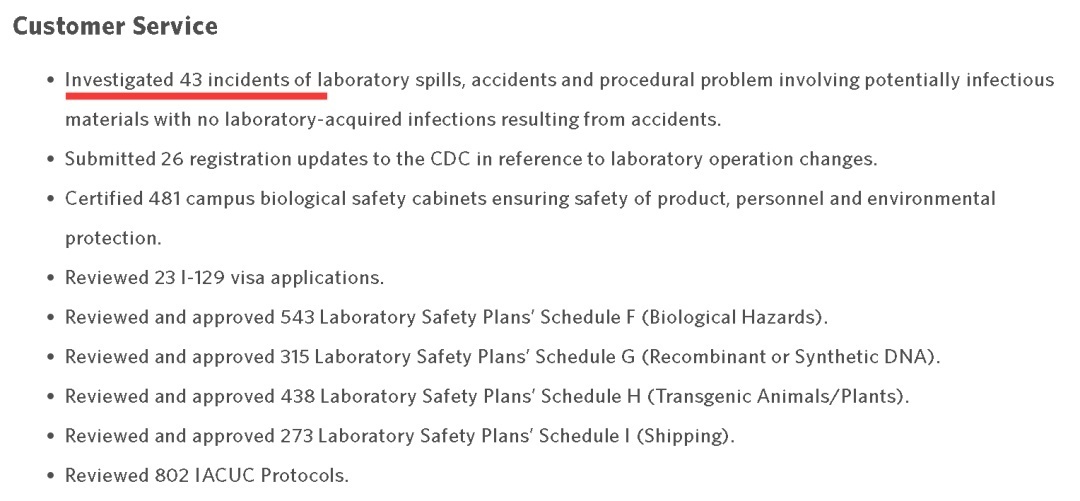 比如2012年的年报显示,当年该校的生物实验室有8起涉及实验室泄露的事故被调查,涉及的是潜在具有传染性的物质。