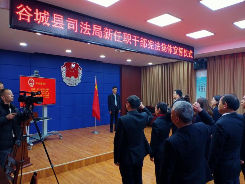 图为谷城县司法局举行新任职干部宪法集体宣誓。