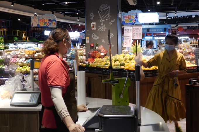 在购物区域,各种物资丰富,鱼肉、蔬菜、水果一应俱全。超市工作人员佩戴口罩规范服务,同时对摘下口罩或不正确佩戴口罩的顾客,及时上前提醒纠正。