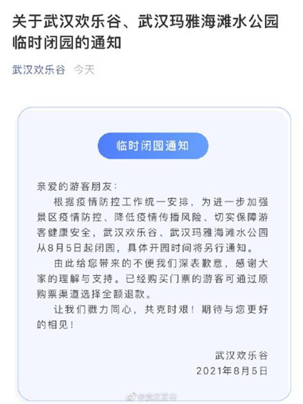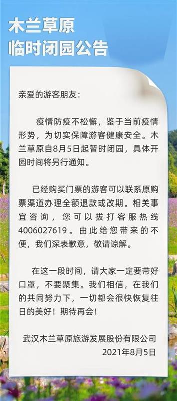 湖北日报讯(记者刘胜)为进一步加强景区疫情防控、降低疫情传播风险、切实保障游客健康安全,武汉欢乐谷、武汉玛雅海滩水公园、黄陂木兰草原5日发布通告,从8月5日起闭园,具体开园时间将另行通知。已购门票的游客可以通过原购票渠道全额退票或改期。